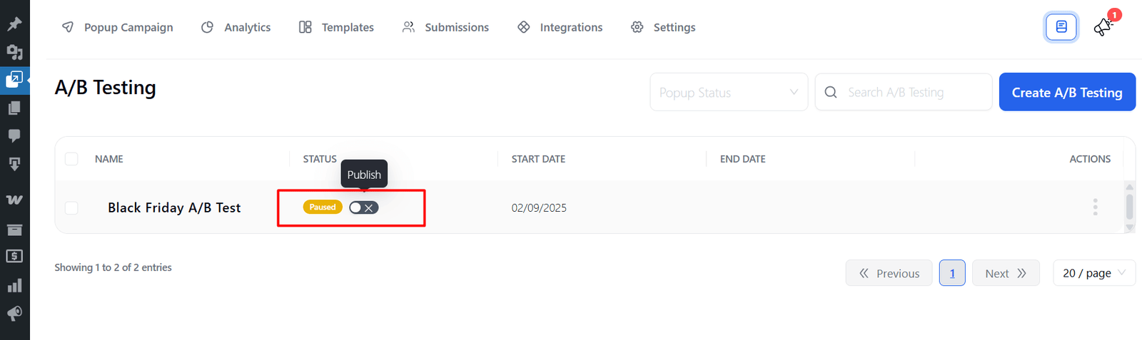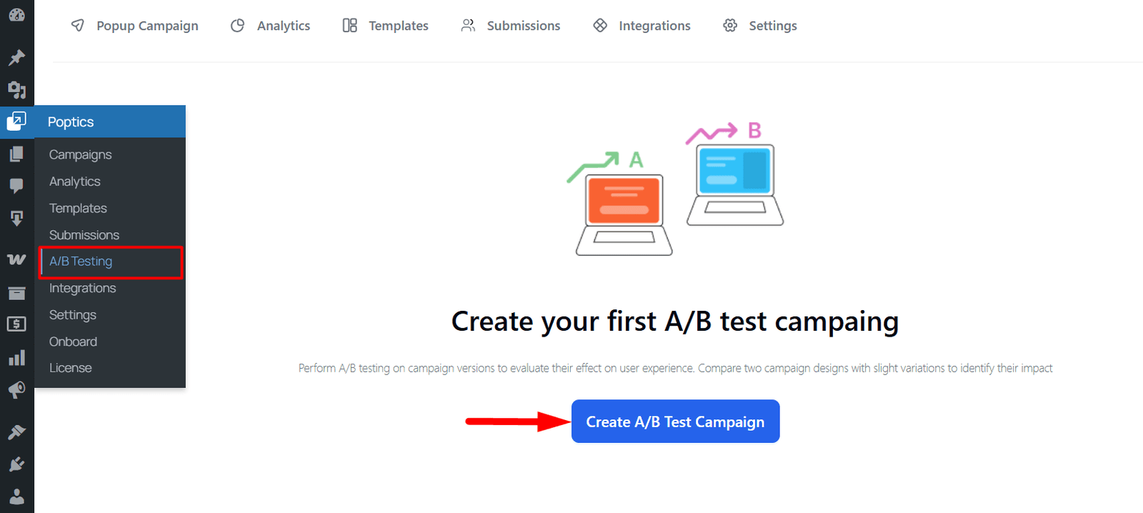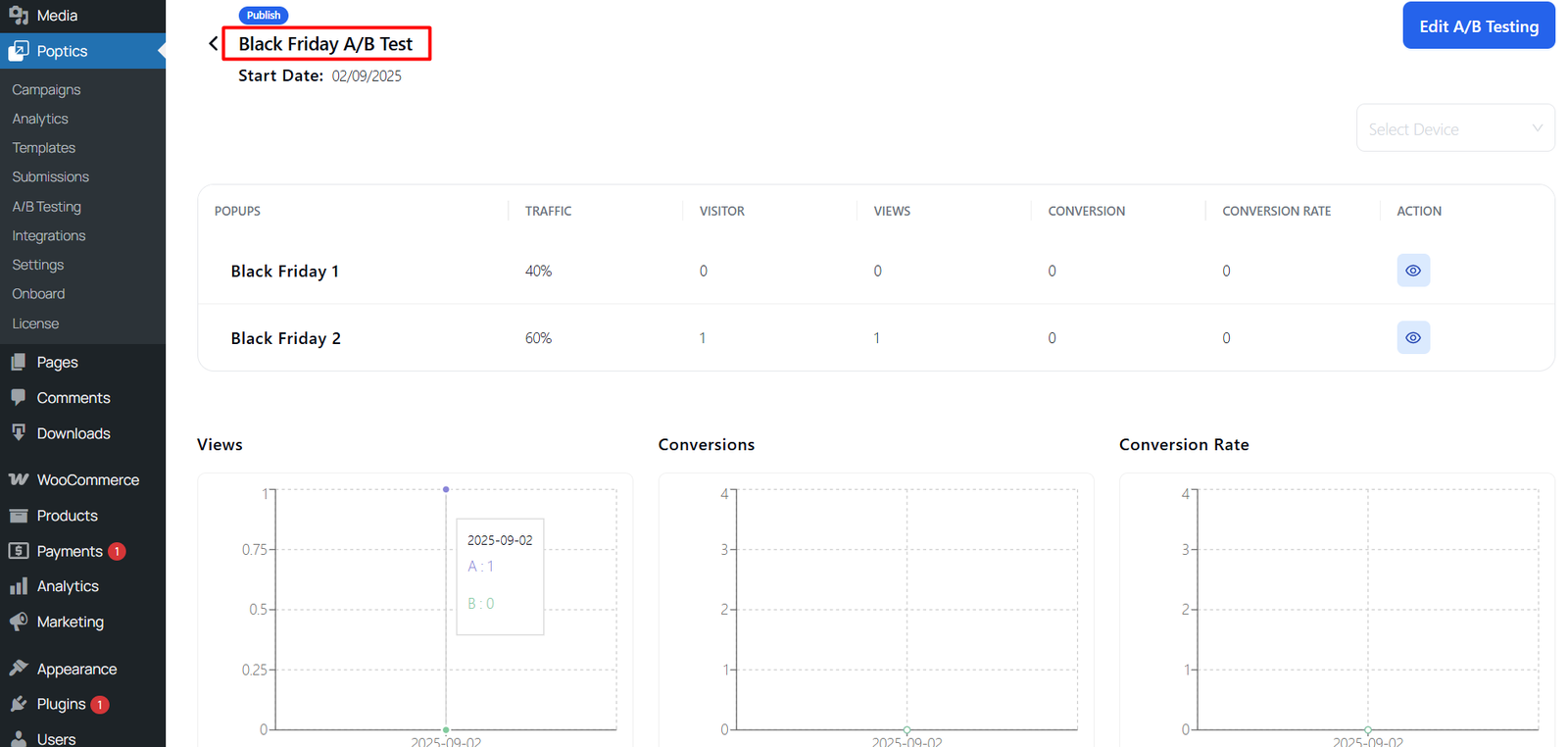 - From your WordPress dashboard, go to Poptics → A/B Testing.
