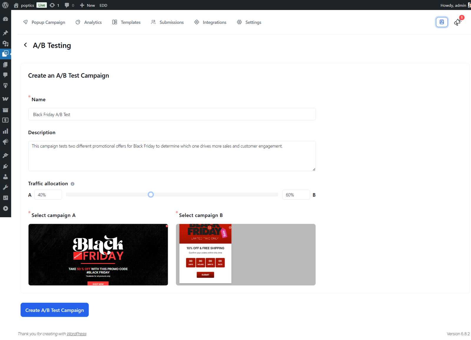 “This campaign tests two promotional offers for Black Friday to determine which one drives more sales and customer engagement.” - Traffic Allocation: Use the slider to split traffic between the two versions. For example, Version A = 40% and Version B = 60%.