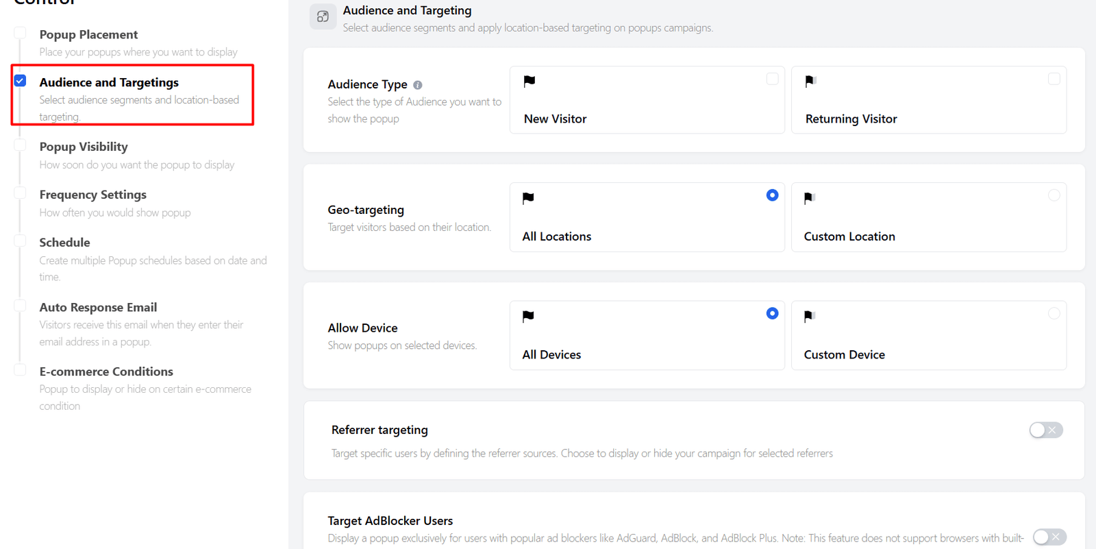 The Audience and Targeting settings let you control who sees your popup and under what conditions. By applying these options, you can ensure your campaigns reach the right visitors at the right time.