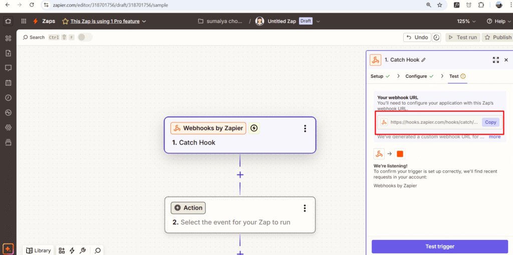 - Paste this Webhook URL in Zapier when creating a new Zap trigger.